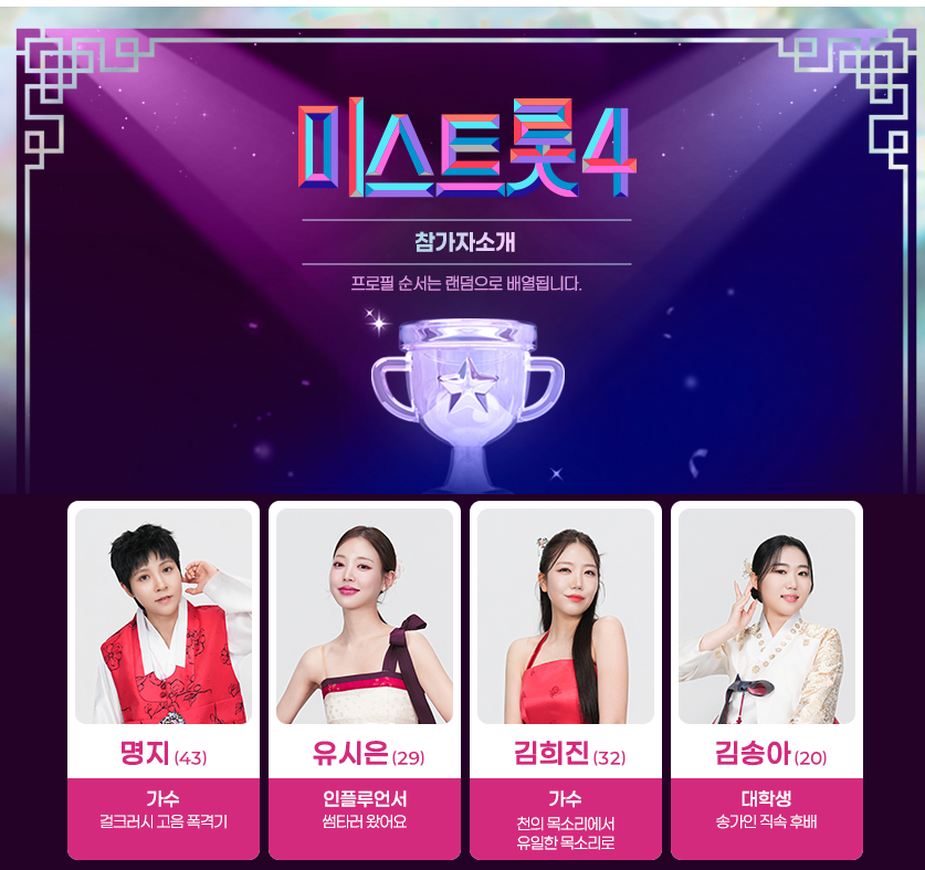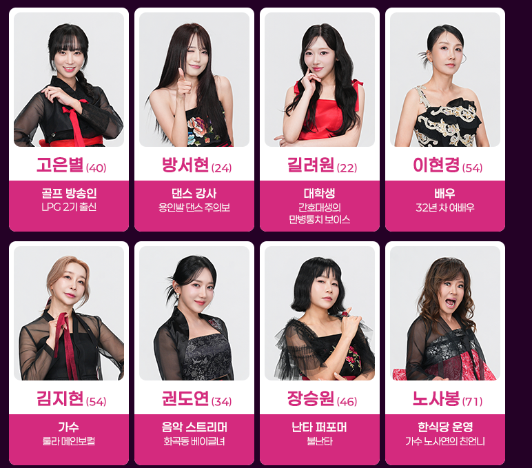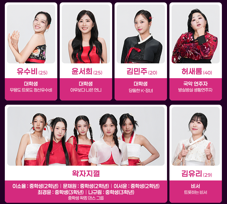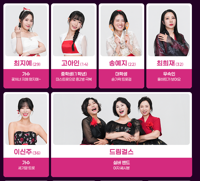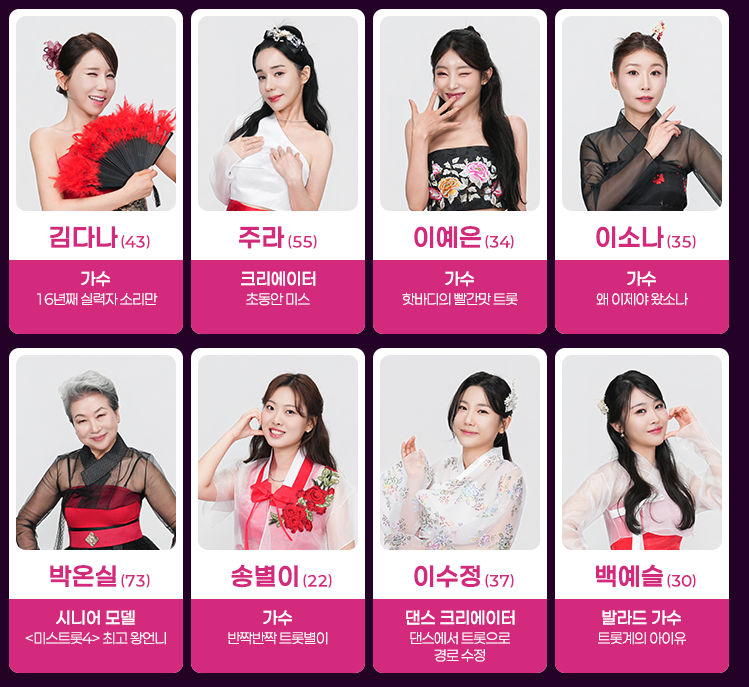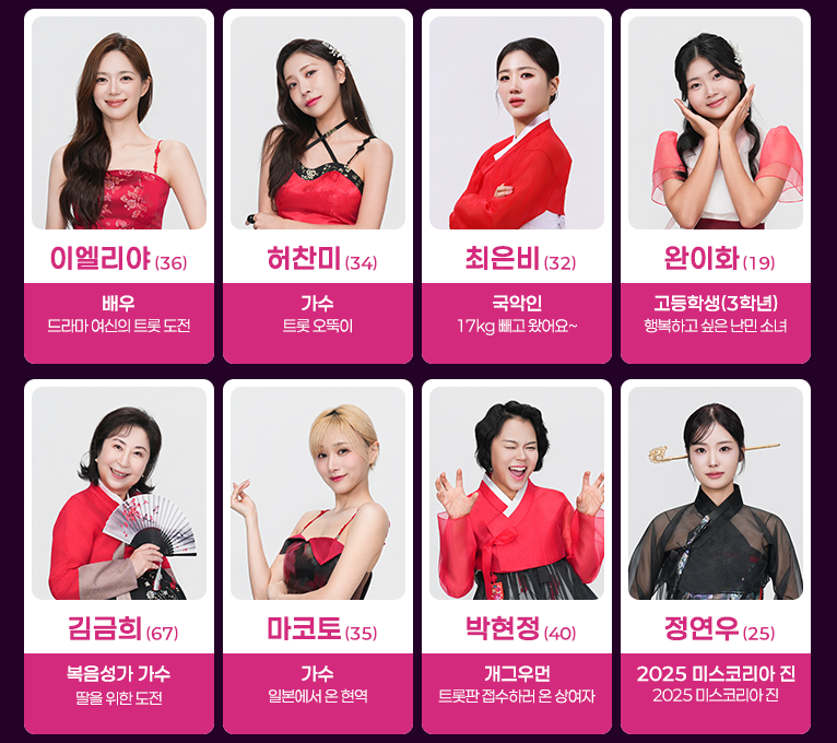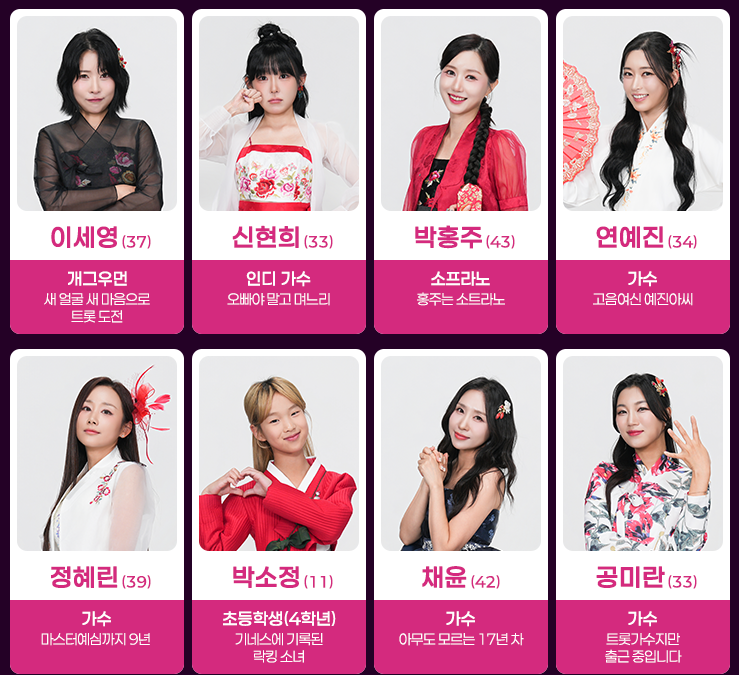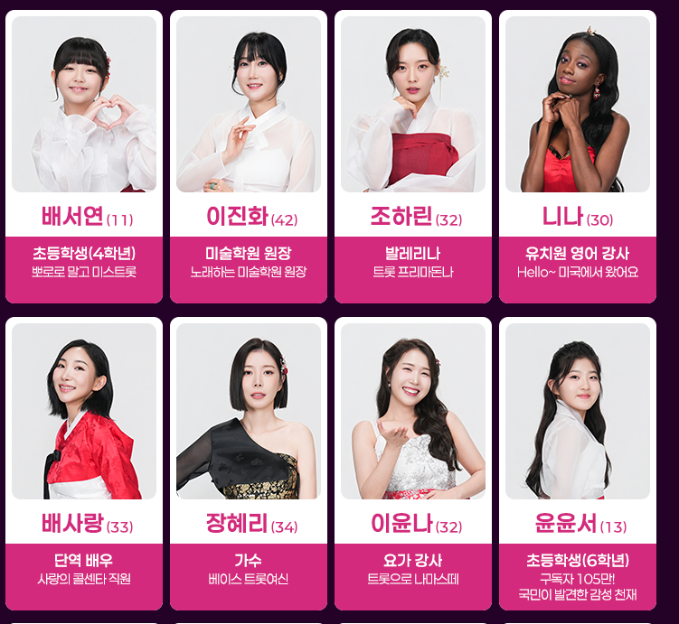| 직업 | 트롯가수, 아이돌, 배우, 일반인 등 |